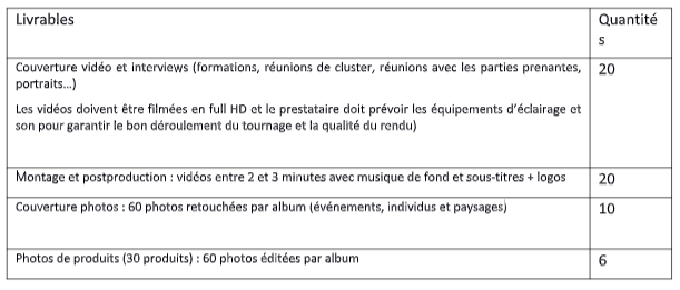 • Reportage vidéo et photo d’événements (formations, réunions de cluster, réunions avec les parties prenantes …) et production et postproduction des vidéos associées. Ces reportages doivent être fournis finis à l’équipe du projet au plus tard sept (7) jours après chaque événement.