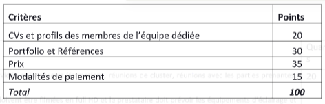 Les candidats seront évalués et classés par un comité d’évaluation selon les conditions décrites dans les critères d’évaluation ci-dessous, avec une valeur globale maximale de 100 points. Les candidats seront d’abord évalués et notés d’un point de vue technique. Les candidats considérés comme techniquement qualifiés seront ensuite évalués en fonction du caractère raisonnable du coût de leur taux journalier. Le contrat sera attribué au candidat ayant obtenu la meilleure note combinée technique et coût.