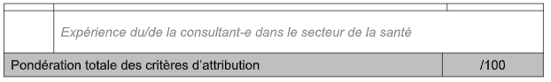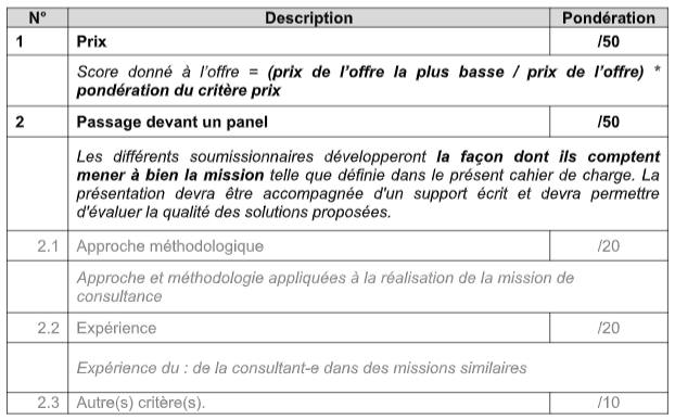 La grille d’analyse suivante permettra à MdM-BE d’évaluer les offres réceptionnées. L’Organisation attribuera une certaine valeur à chaque critère. Sur base de l’évaluation de tous ces critères et tenant compte de la valeur attribuée à chacun, le marché sera attribué au soumissionnaire présentant l’offre la plus avantageuse.
