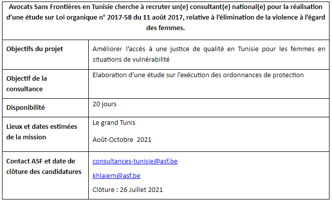 Le/la consultant.e est amené.e à participer et animer un atelier sur la thématique de la Loi organique n° 2017-58 du 11 août 2017, relative à l’élimination de la violence à l’égard des femmes, et l’exécution des jugements avec les acteurs de la justice et les parties prenantes afin de débattre les lacunes de la mise en œuvre de la loi susmentionnée.