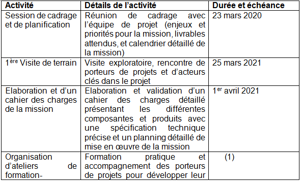 La durée totale de mise en œuvre de la mission est programmée sur une durée totale de 4 mois (début avril- fin juillet 2021). La mise en œuvre de la mission suivra l’échéancier suivant :