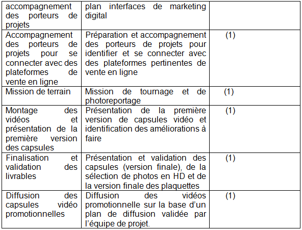 04 capsules vidéo promotionnelles d’une durée ne dépassant pas 2’30 chacune et destiné essentiellement à une diffusion sur les réseaux sociaux. Les vidéos valoriseront la qualité et la spécificité des produits locaux. La version originale des capsules vidéo sera réalisée en arabe avec un sous-titrage en français.  Les capsules seront livrées avec l’ensemble des documents originaux (Rushes). L’identification des produits/services priorisés sera réalisée avec l’équipe de projet. Le contenu des capsules (scénarios, choix des sites et des plans, …sera développée et proposé par le prestataire et validé avec l’équipe du projet).