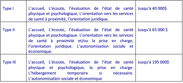 Les montants alloués par projet varient selon le type de projet proposé et les différents services offerts aux femmes victimes de violence/et ou en situation de vulnérabilité.