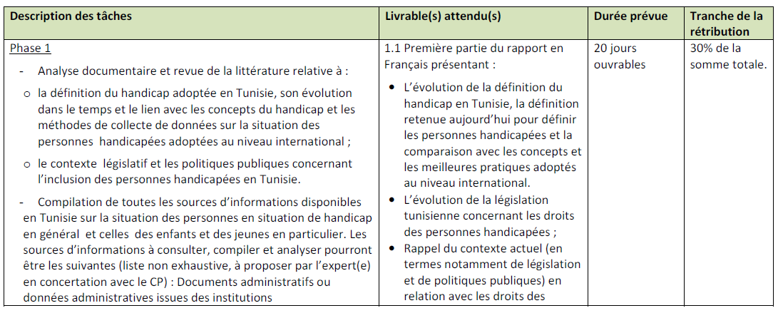 La mission se déroulera en Tunisie. L’analyse documentaire et la collecte des sources d’information sur la situation des personnes handicapées se dérouleront à l’échelle nationale. Des entretiens avec les représentant(e)s des institutions et organisations tunisiennes impliquées dans la production de connaissances sur les personnes handicapées devront être envisagés tout le long de la mission.