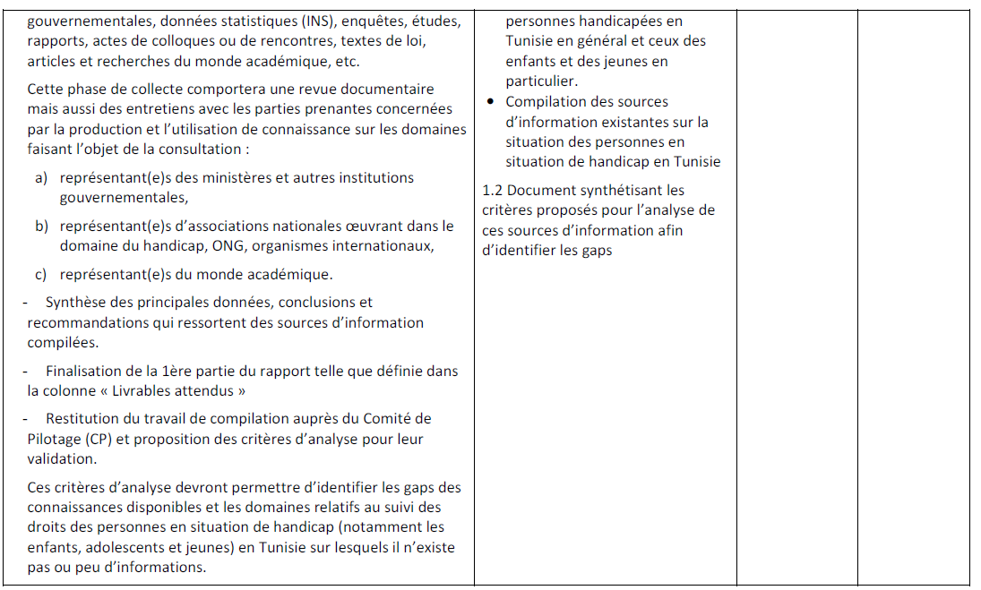 A la lumière de cela, un Groupe de travail sur les statistiques du handicap institué au sein du Conseil National de la Statistique(CNS) et présidé par le Ministère des Affaires Sociales a tenu une série de réunions avec la participation de l’UNICEF pour examiner les différentes approches nationales et internationales existantes de mesure du handicap et de proposer des moyens à même d’améliorer les statistiques sur ce sujet. Le groupe de travail a jugé qu’il est fondamental de dresser un état des lieux critique des sources d’informations disponibles en Tunisie sur la situation des personnes en situation de handicap et de faire une analyse de leur qualité et ceci dans le but d’identifier les gaps existants entre les données disponibles et les critères de qualité que ces données devraient remplir. Cette analyse permettrait d’identifier les domaines sur lesquels il y a un manque d’informations quant à la situation des personnes handicapées en Tunisie.