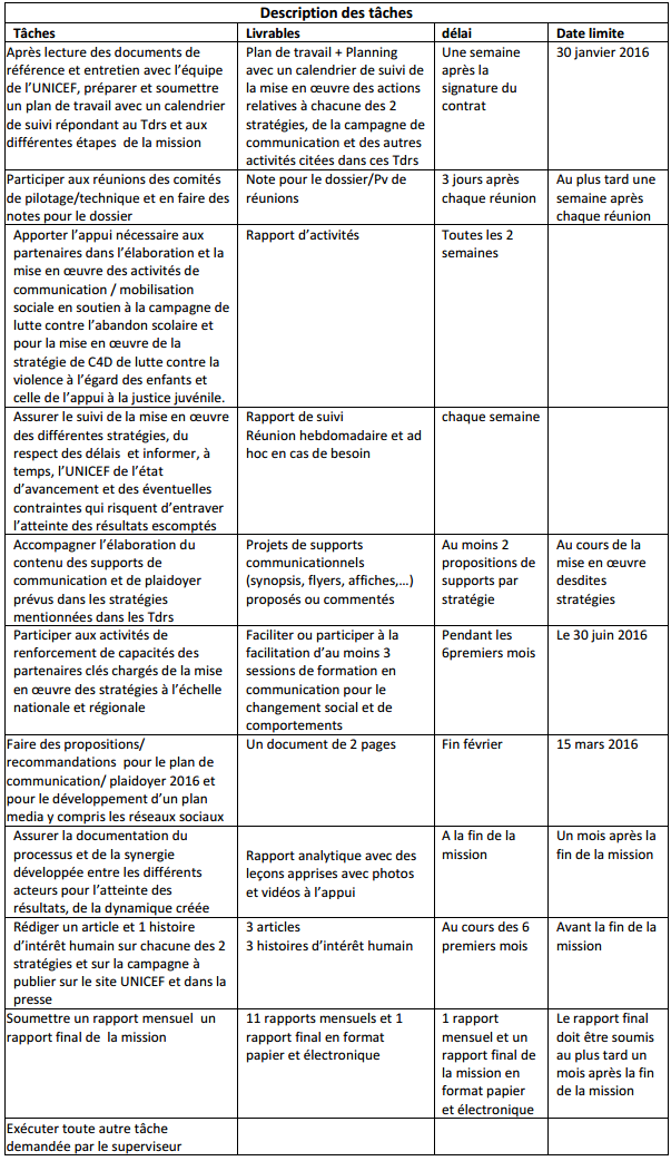 Le (la) consultant(e) apportera un appui technique à l’UNICEF, assurera l’exécution des tâches mentionnées dans le tableau ci-dessous en rapport avec les différentes stratégies et soutiendra le bureau dans leur suivi et leur mise en œuvre. Il/elle veillera à garder l’UNICEF informé, tout au long du processus, de l’état d’avancement des actions planifiées et servira de liaison entre l’UNICEF, les autres consultants et les agences de communication. Il/elle contribuera à la mesure de l’impact des actions entreprises.