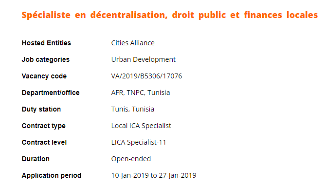 Cities Alliance cherche un(e) spécialiste en décentralisation hautement motivé(e) et qualifié(e) qui jouera le rôle de support dans le processus de décentralisation, la réforme des finances locales et la fiscalité locale, ainsi que le suivi des projets du programme-pays en Tunisie. Il/elle relèvera du chargé du programme-pays et travaillera en étroite collaboration avec l’équipe du programme-pays et le Secrétariat de Cities Alliance à Bruxelles, ainsi qu’avec les membres et partenaires de Cities Alliance.