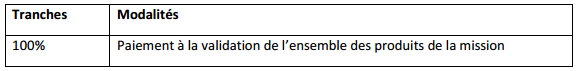 Le paiement des honoraires interviendra en une seule tranche, conformément aux modalités indiquées dans le tableau ci-dessous :