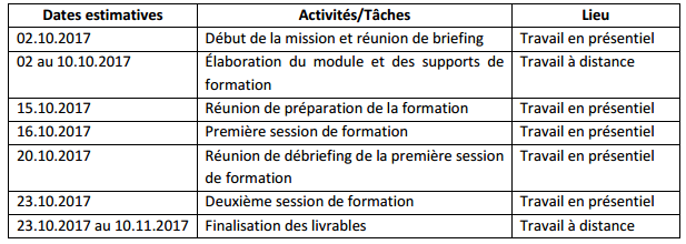 La durée de la mission est estimée à un maximum de 9 hommes/jours répartis sur la période allant du  02 octobre au 10 novembre 2017.