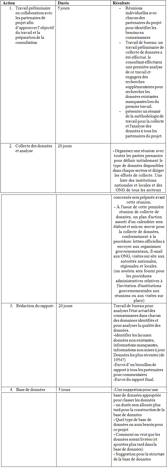 Le résultat de la consultation sera un rapport énumérant, catégorisant et analysant toutes les données disponibles dans tous les différents domaines, comme spécifié dans les livrables, afin de guider la mise en œuvre des mesures de conservation et de développement durable.