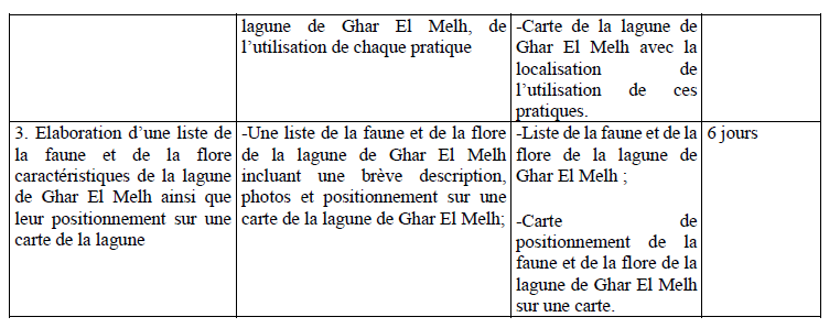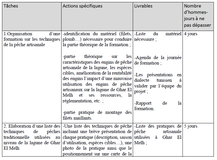 Le prestataire de service sélectionné aura pour mission de former un cercle de pêcheurs qui sera identifié par l’équipe du projet sur les techniques de pêche sélective. La formation (une journée) alternera entre une partie théorique permettant aux pêcheurs de mieux se familiariser avec les caractéristiques des différents engins de pêche de la lagune, les espèces cibles, amélioration de la rentabilité des engins de pêche, l’impact d’une mauvaise utilisation des engins de pêche artisanaux sur la lagune de Ghar El Melh et ses ressources, etc. et une partie théorique de montage de filets maillants.