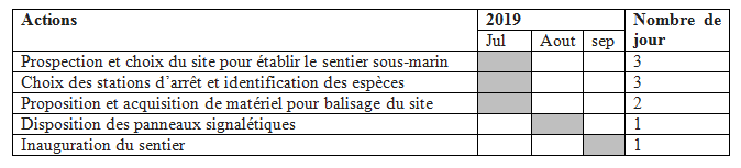 Le circuit choisis sera répartie en plusieurs stations de sensibilisations. Pour chaque station, des fiches descriptives seront disposées pour décrire les facies particuliers, au moyen de panneau immergé durant la saison estivale. Un guide plongeur, sera chargé d’accompagner les visiteurs durant leur visite en leur prodiguant les informations et l’assistance nécessaire.