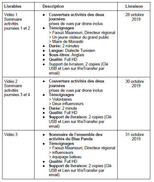 le reportage comprendra une série de photos qui résument la totalité des activités du Blue Panda pendant sa visite en Tunisie dans le port de plaisance à Monastir Du 27 au 30 Octobre, chaque jour, l’agence/le photographe est appelé à livrer un minimum de 50 photos couvrant les activités de la journées. Les photos doivent être édité en version finale exploitable.