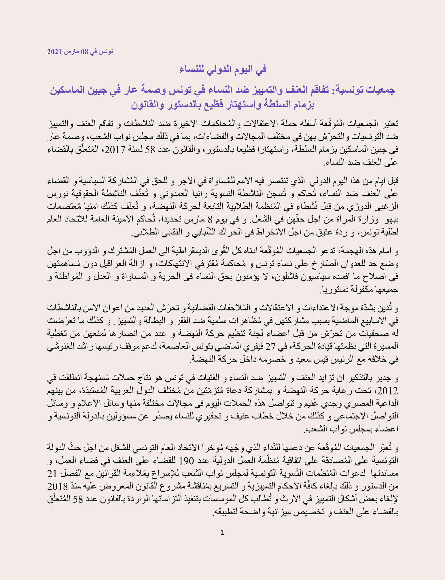 جمعيات تونسية: تفاقم العنف والتمييز ضد النساء في تونس وصمة عار في جبين الماسكين بزمام السلطة واستهتار فظيع بالدستور والقانون