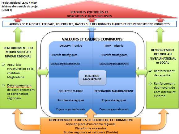 Les mouvements pour la défense des droits des personnes handicapées dans les trois pays en sont aussi à des stades différents de développement. Au Maroc et en Algérie, ils sont assez solides et possèdent une bonne expérience en matière de dialogue avec le gouvernement, alors que le mouvement tunisien, en raison des restrictions imposées à la société civile sous Ben Ali, est beaucoup plus récent. L’ajout potentiel de la Libye, non encore formalisé à la rédaction de ces TDR, pourrait aussi changer la structuration du mouvement régional du handicap.